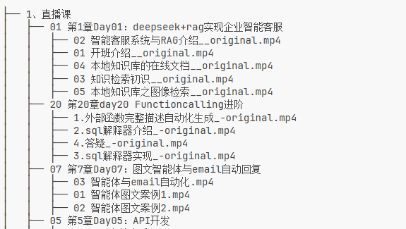 │ │ ├── 02 智能客服系统与RAG介绍_original.mp4 │ │ ├── 01 开班介绍__original.mp4 │ │ ├── 04 本地知识库的在线文档__original.mp4 │ │ ├── 03 知识检索初识__original.mp4 │ │ ├── 05 本地知识库之图像检索__original.mp4 │ ├── 20 第20章day20 Functioncalling进阶 │ │ ├── 1.外部函数完整描述自动化生成-original.mp4